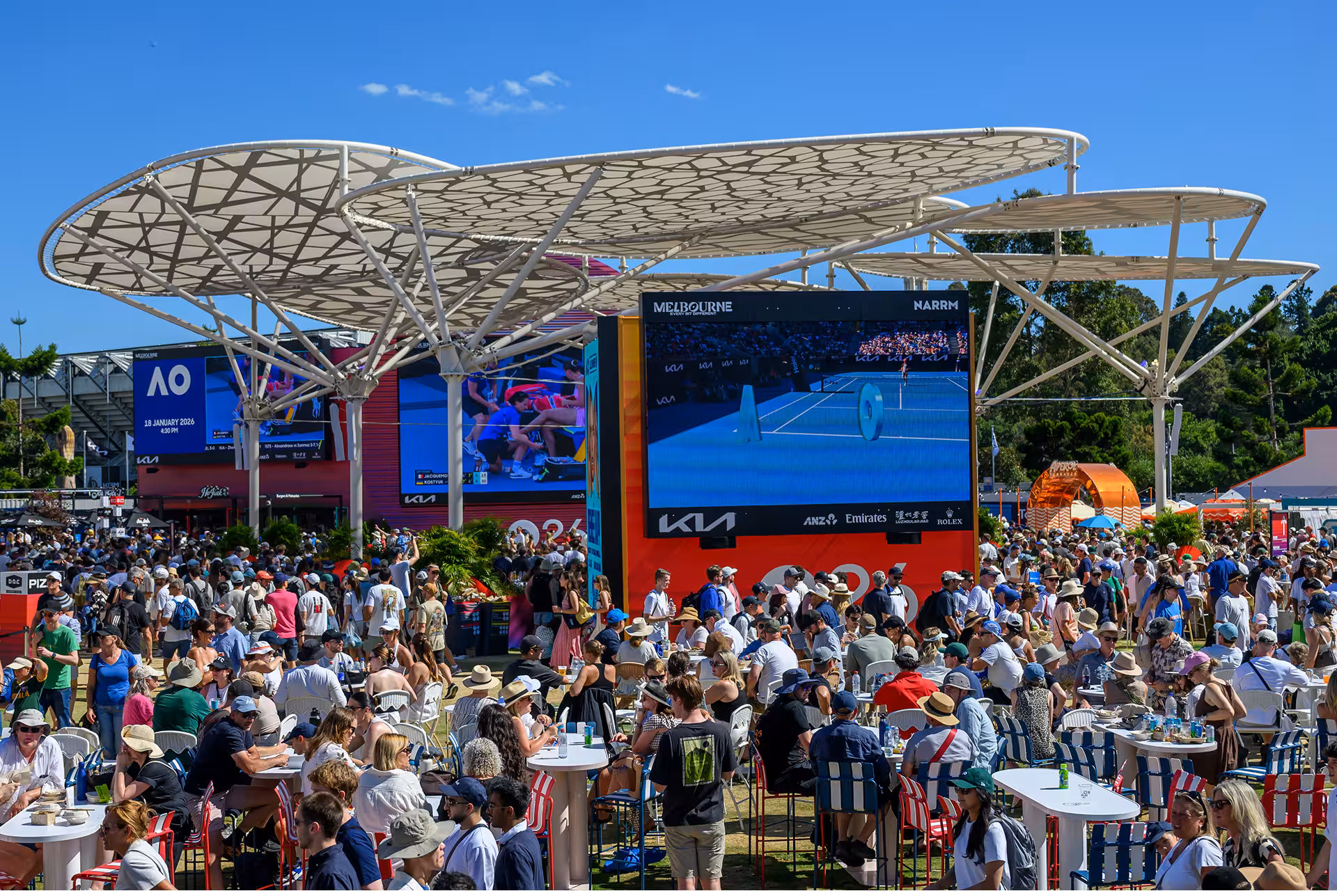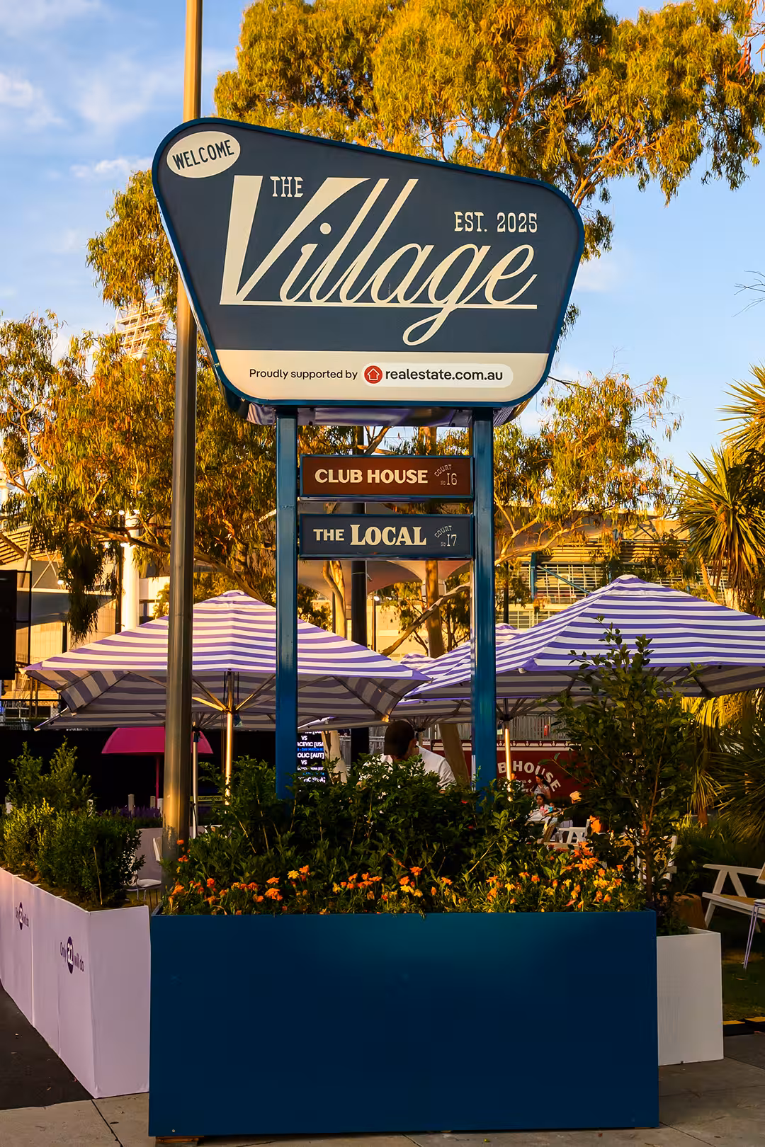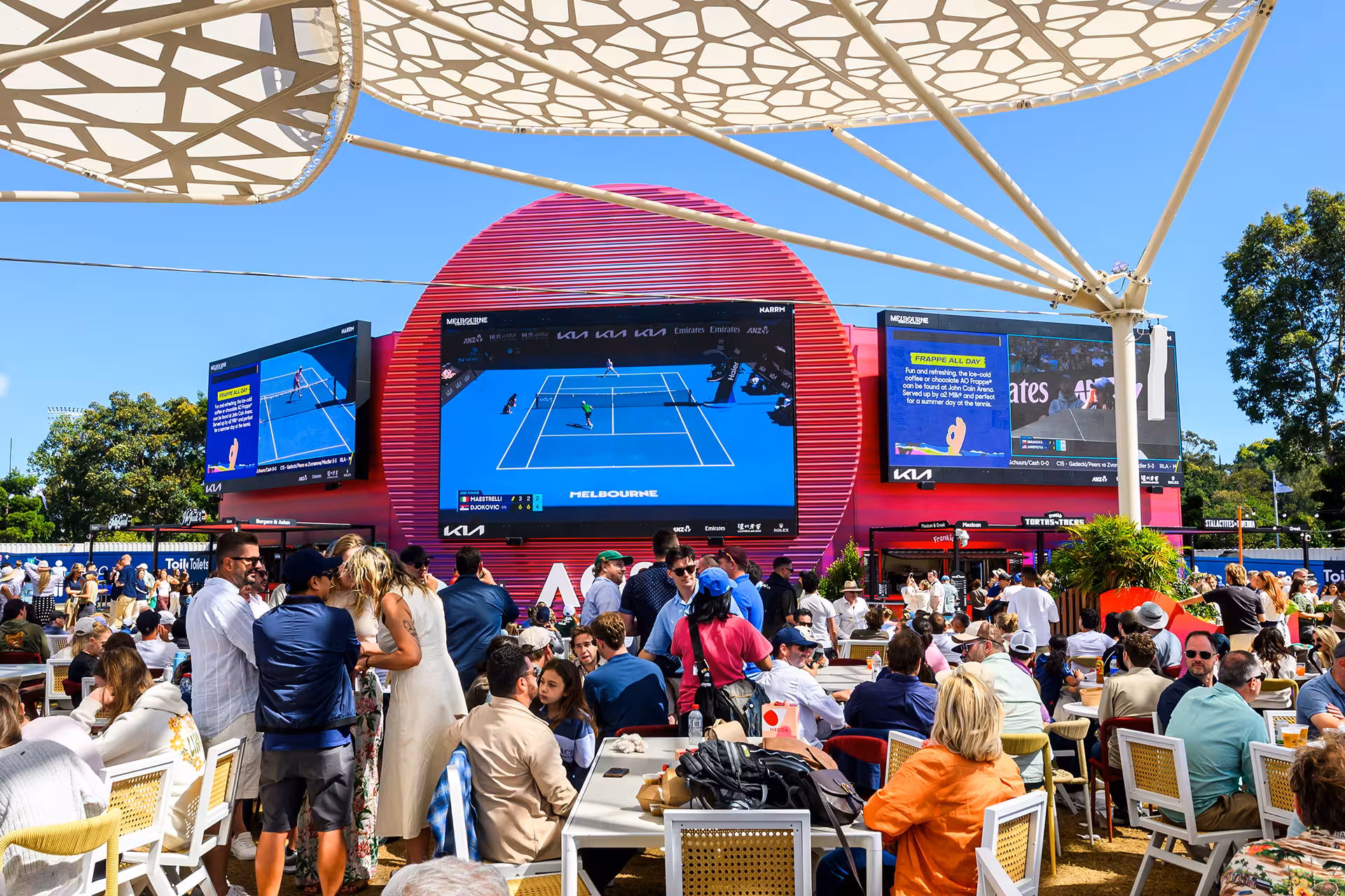 Premium architectural treatments elevated arenas and hospitality zones, while guest areas were activated with branded deck chairs, integrated planters, accessible tables made from recycled materials, and tailored treatments across DJ booths, bars and food outlets. Programmable lighting added a standout after-dark layer, extending the impact well into the evening sessions. Every corner of the Melbourne Park precinct packed a branded punch – day and night, whatever the weather.